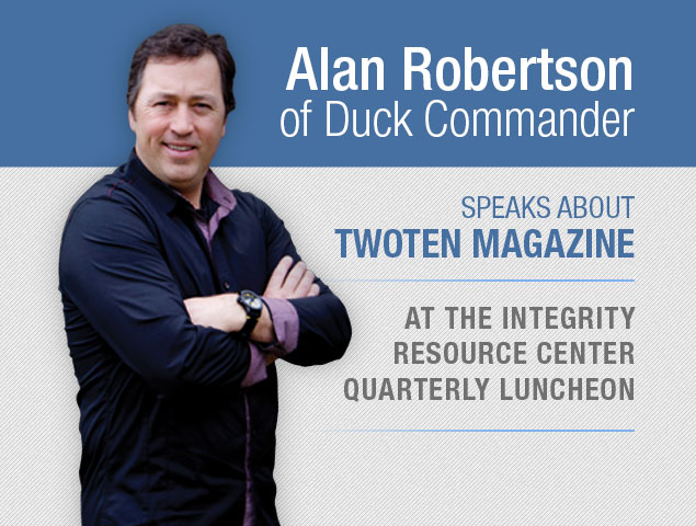 Recently our friend, Alan Robertson of Duck Commander, spoke at Integrity Resource Center's Quarterly Luncheon and shared about TwoTen Magazine (see video below). We are always thankful when others share about the mission and vision of TwoTen Magazine. If your organization is hosting an event and would like to take an opportunity to share about TwoTen Magazine, please feel free to get in touch with…